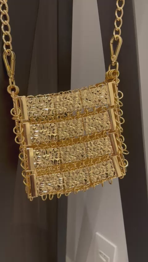Bolsa em metal dourado, possui alça longa em corrente medindo 1m. Peso 700 gramas.