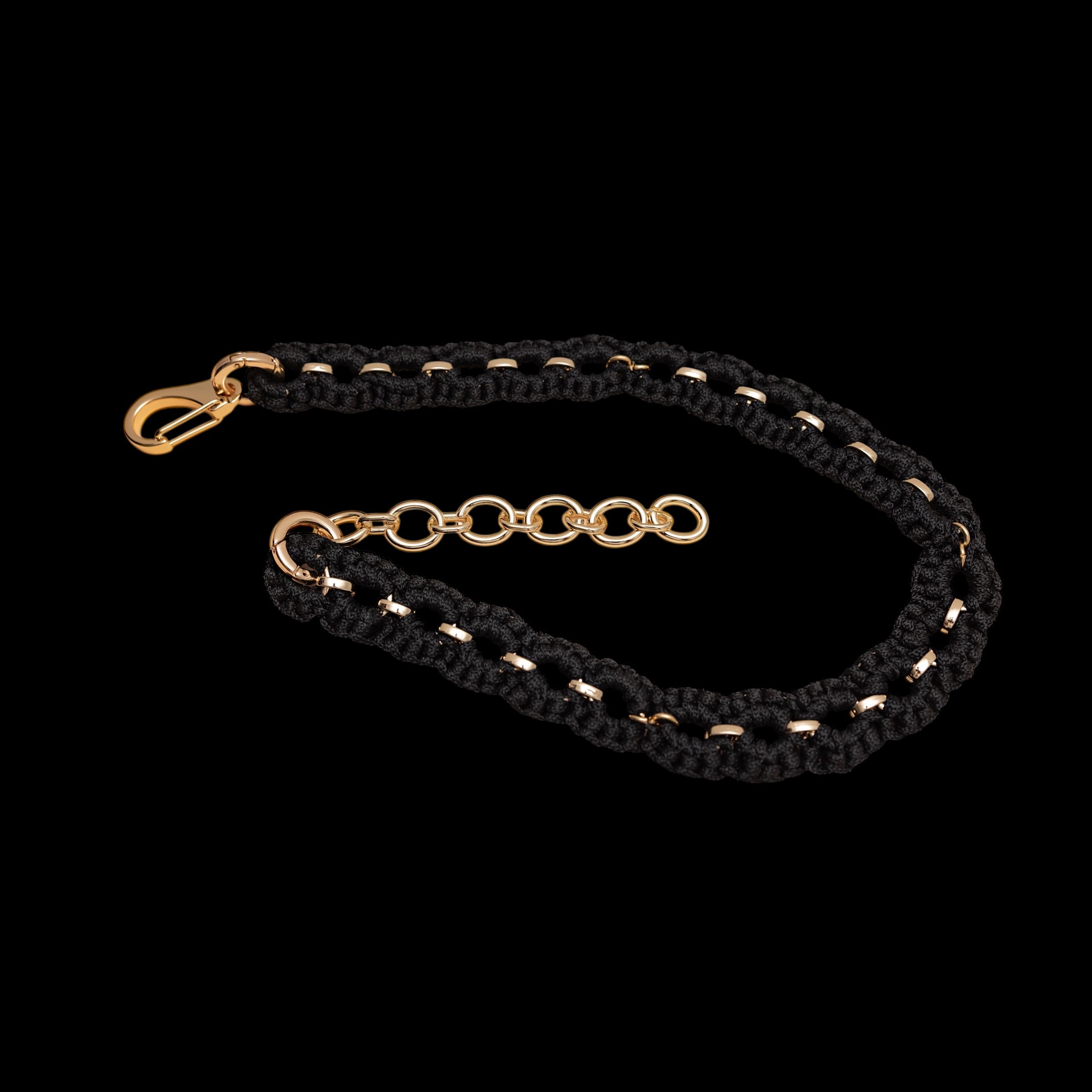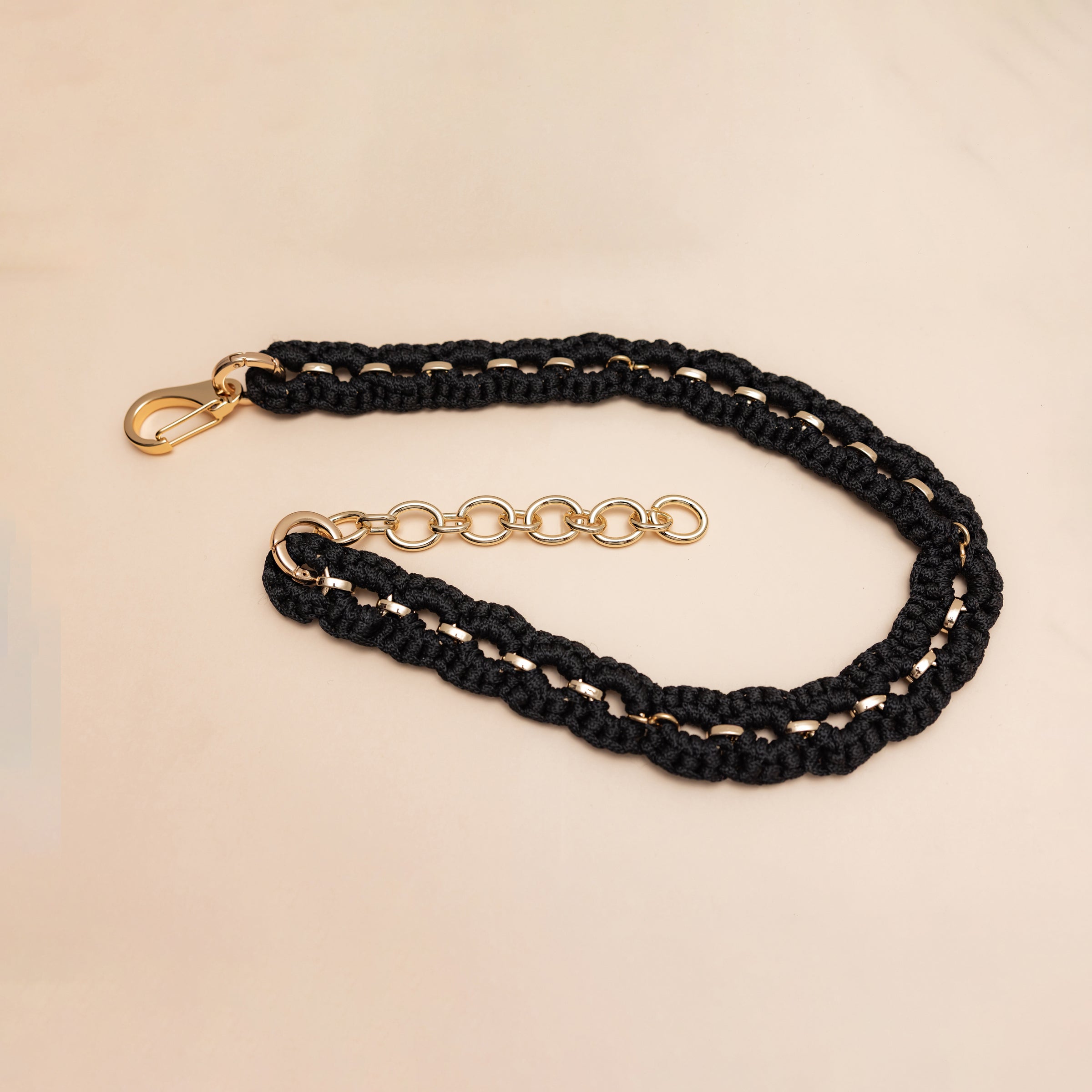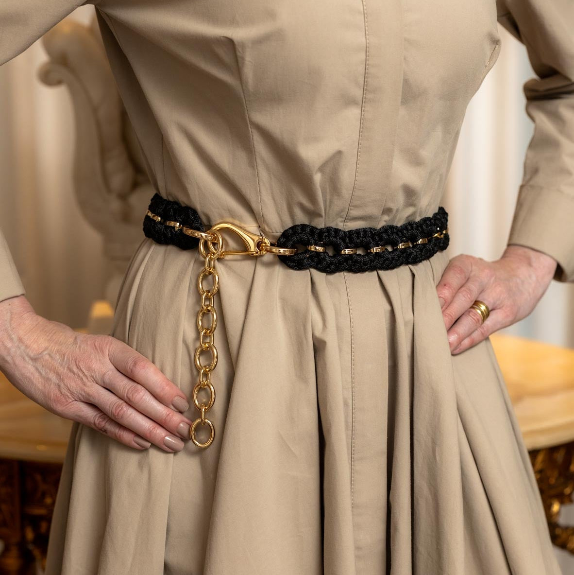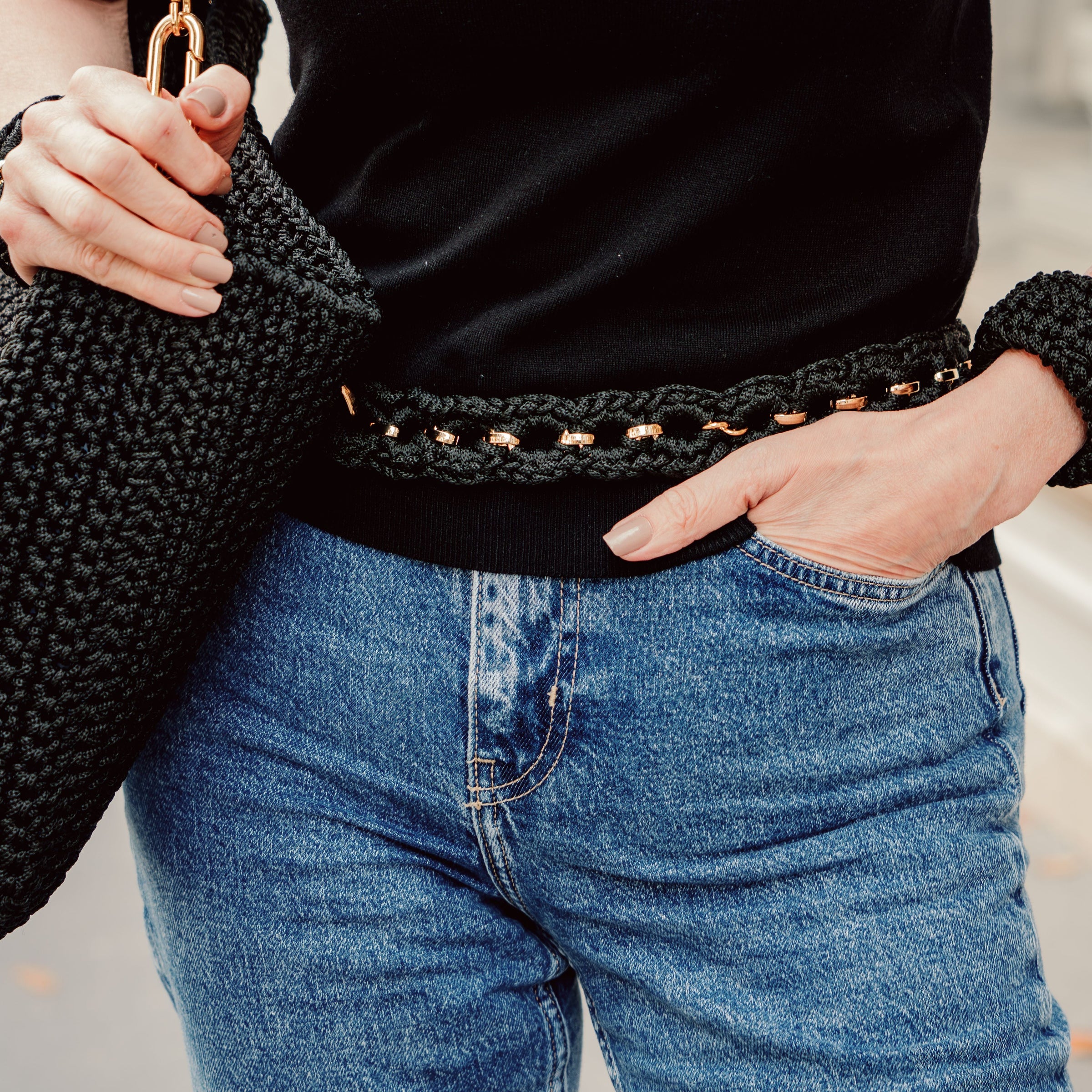 Cinto em Crochet e metal premium. Fechamento em mosquete medida 90cm, ajustável.