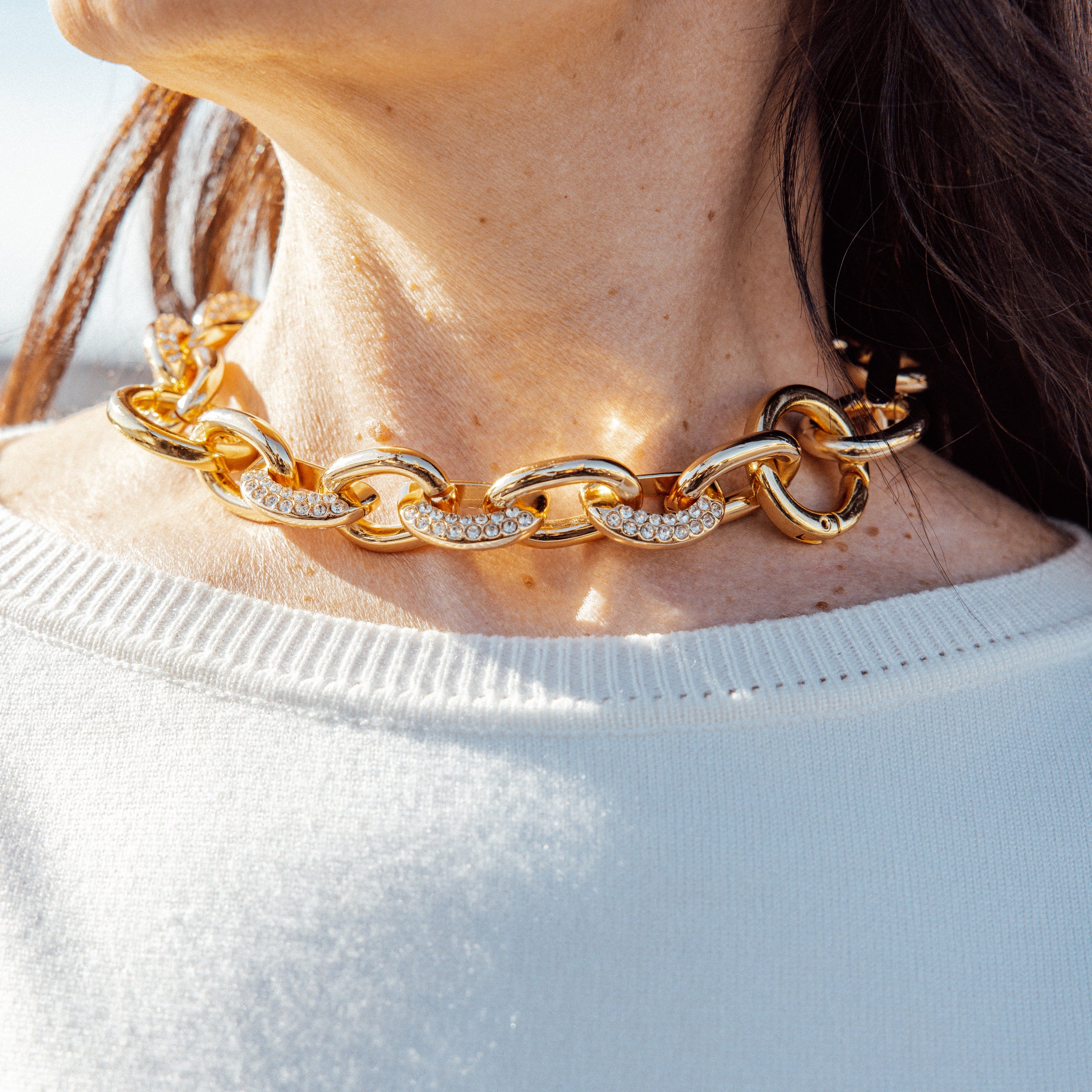 Colar dourado em metal premium com strass. Fechamento mosquete. Medida 45cm.