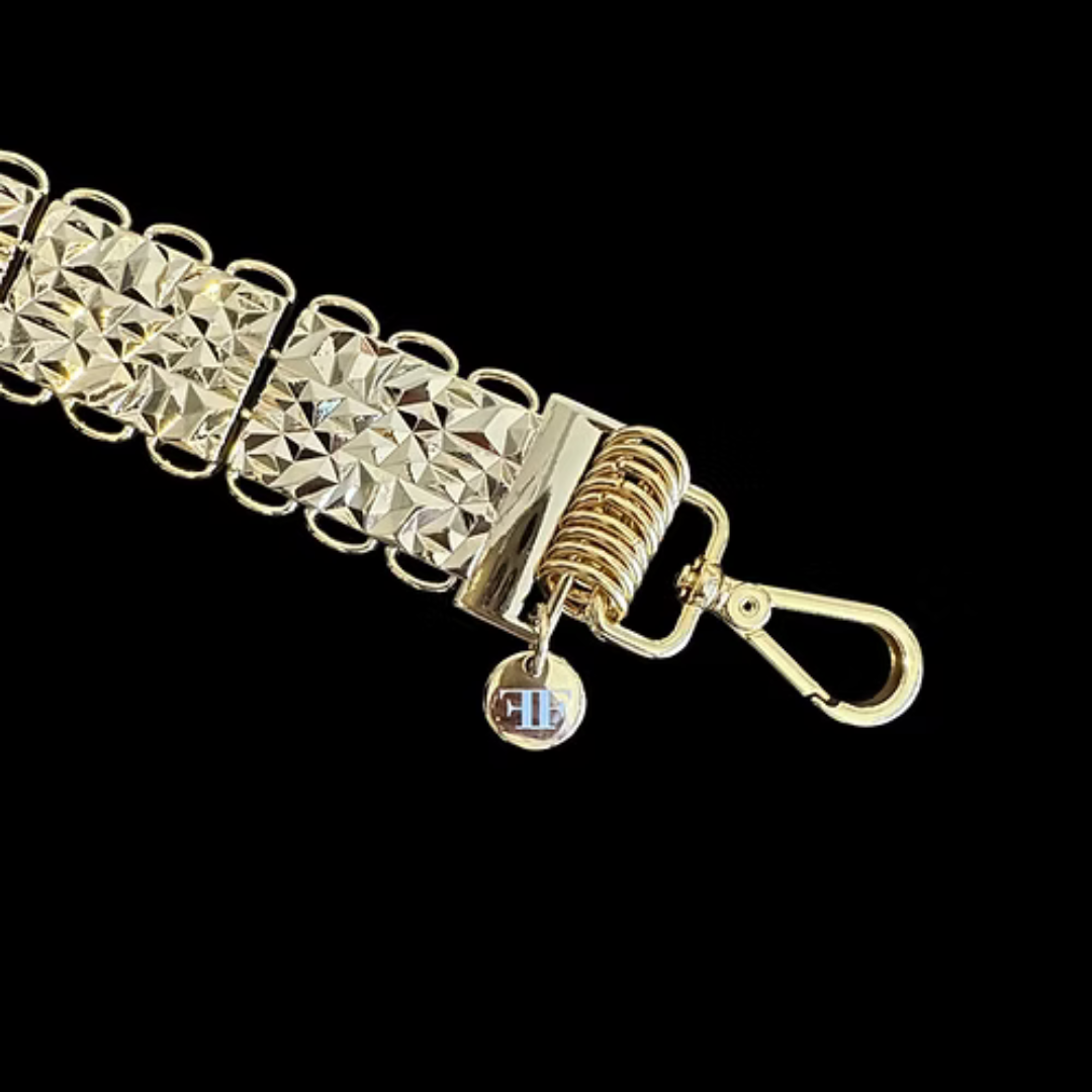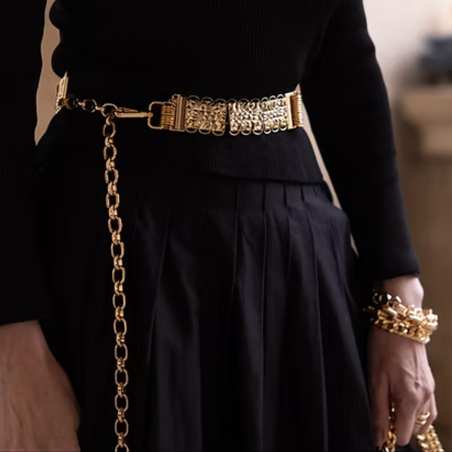 Cinto em metal dourado. Medida 85cm mais 40cm de corrente extensora, medida total 1,25m.